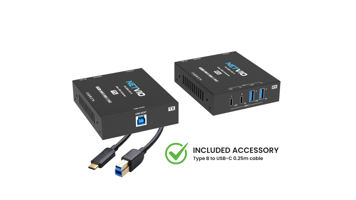 No. The USB-C ports on the receiver are for USB data and peripheral connections only. They do not support DisplayPort Alt Mode or HDMI output, which are required for video transport over USB-C. This means you cannot connect a display or monitor directly to the extender via USB-C. To extend video alongside USB, you would need to use Netvio’s HDMI or AVoIP solutions in combination with the USB extender.